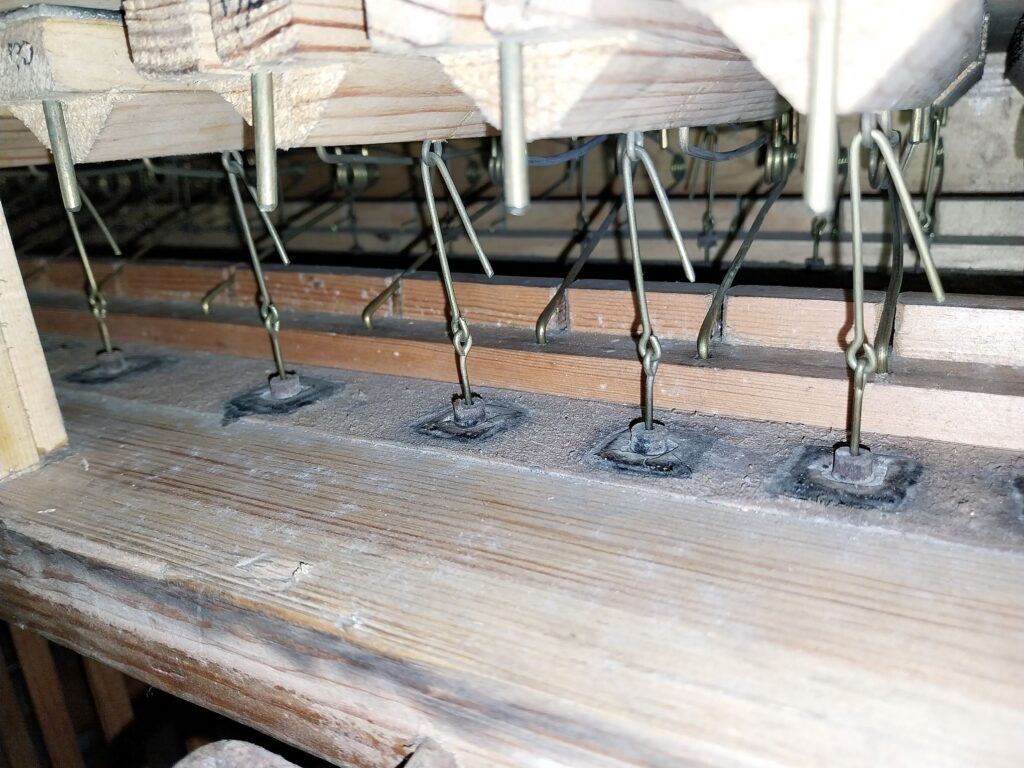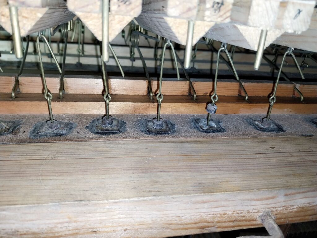 Weiterhin konnten die auffällig starken Spielgeräusche etwas gemindert werden durch Einfügen von Tuchscheiben zwischen den Tasten und den Trakturwippen.